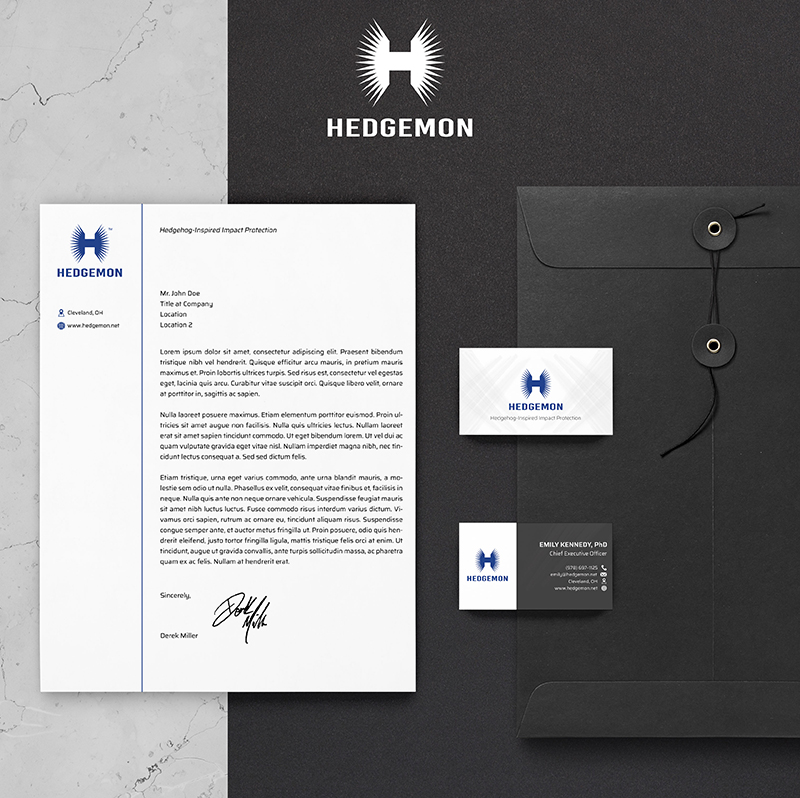 Hedgemon is a company based in Cleveland, OH that was founded around biomimicry, which means that it looks to nature as inspiration for innovation. Hedgemon specializes in impact protection, and looked at the hedgehog and its quills to develop a novel structure can be used in helmets, product transport, and more! Just like their product, we needed to develop an identity, branding, and a presentation using their existing logo that looked strong, bold, and resilient.